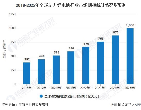 除电动汽车市场外,锂电池也成为了各大应用市场领先的电池技术,包括移动设备、电网储能等。国际市场研究机构Adroit Market Research发布的报告称,全球锂离子电池市场将在2018-2025年的预测期内以14.3%的复合年增长率增长,预计到2025年,全球锂离子电池市场规模估计将超过1000亿美元。易于获得、高能量密度、低放电率和长寿命周期是使锂离子电池优于同类产品的一些关键特性,并有望促进全球市场收入。